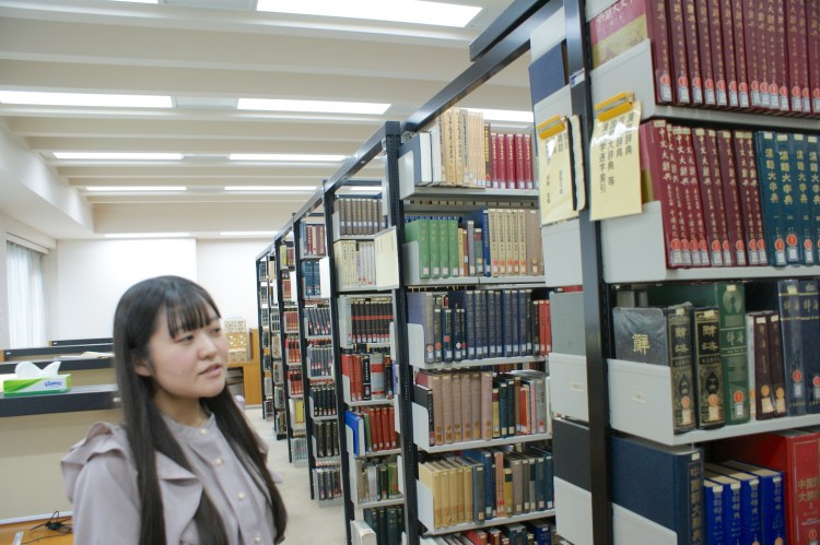 国文学専攻研究室の特徴は、とにかく本が多いことですね。他の研究室とは、書棚の棹の数が違うと思います。選書は教員と話しあって決めています。自治組織として院生会はありますが、書籍や機器その他院生室の管理全般を担うのと、あとは懇親会などの担当でしょうか(笑)。毎年4月に、学部の新入生を対象にした、図書館や院生室のオリエンテーションなども行っています。院生独自の研究雑誌はありませんが、上智大学国文学会を教員と協力して運営していまして、機関誌の『国文学論集』には、院生たちも多く執筆しています。国文に入ってくるひとはもれなく本好きでしょうから、居心地は最高によいと思います。〔大友あかりさん紹介〕